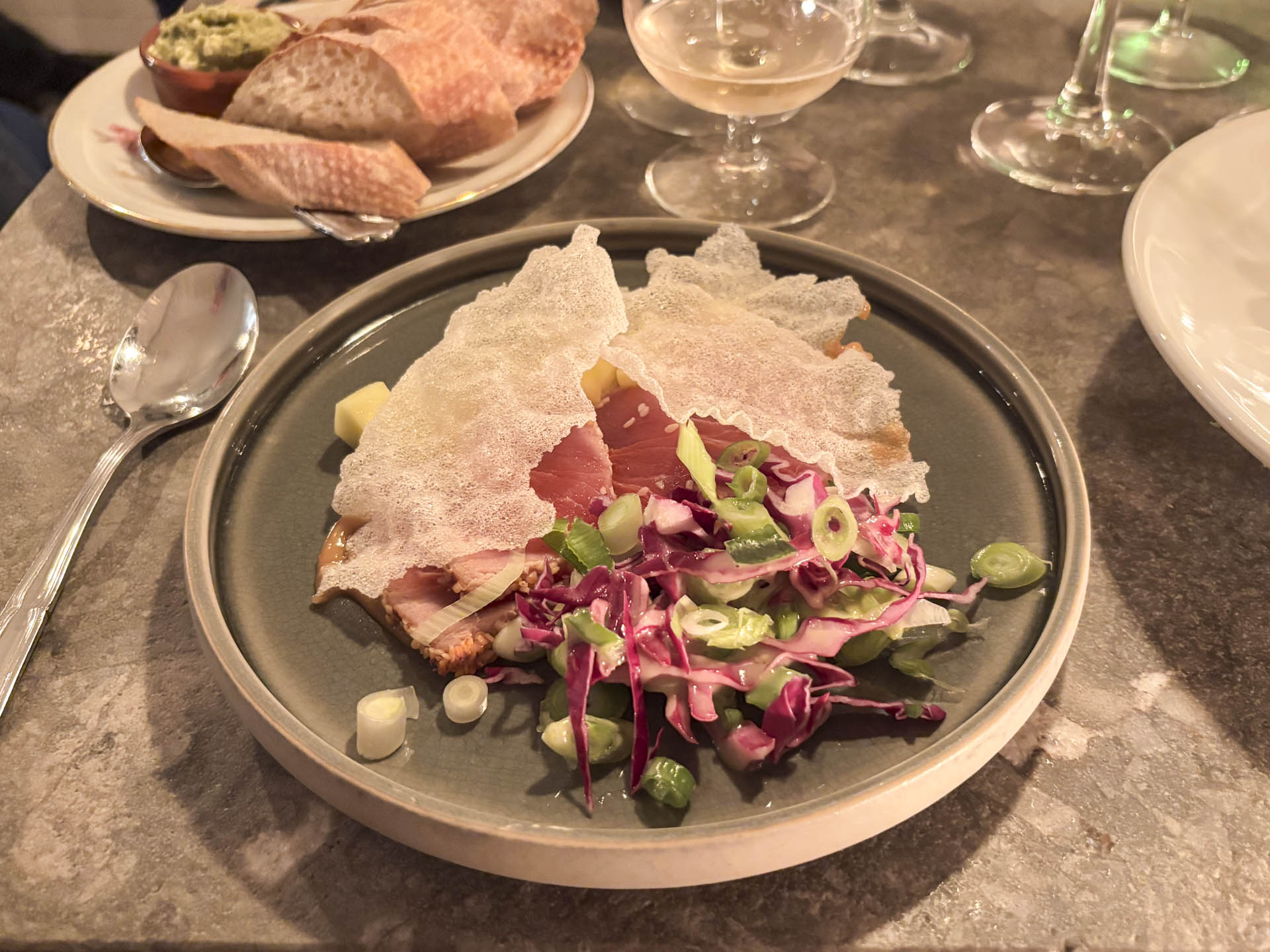 Lynstegt tun vendt i sesam, serveret med grønt tilbehør og Juliettes egen sauce sashimi, som gav en syrlig balance i retten. Tunen var imponerende mør og smørblød. Den var ikke kold, men stuetemperatur, som den skal være.