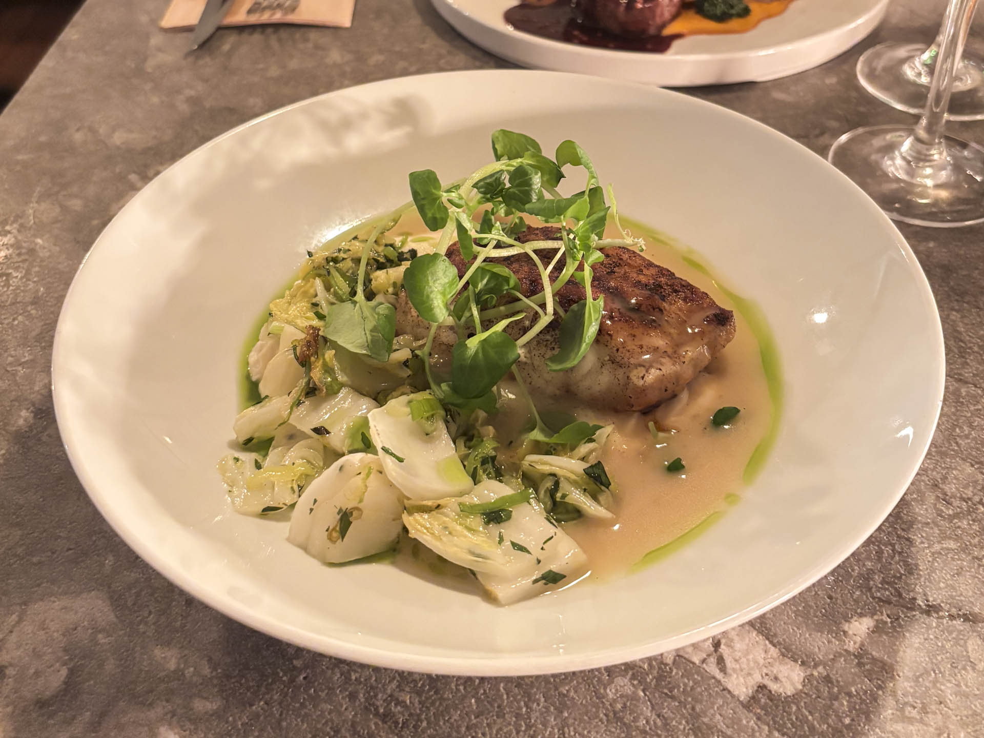 Her er tre retter: forret, hovedret og dessert. Vi begyndte med en jordskokkebisque med kataifi-friteret kammusling, jordskokkechips, hasselnød og brunet smør. En smuk og varm ret, hvor bisquen var silkeblød og nøddeagtig, og de sprøde kataifi-tråde af filodej gav en perfekt kontrast til kammuslingen, der var stegt, fast, mør og saftig, som den skal være.