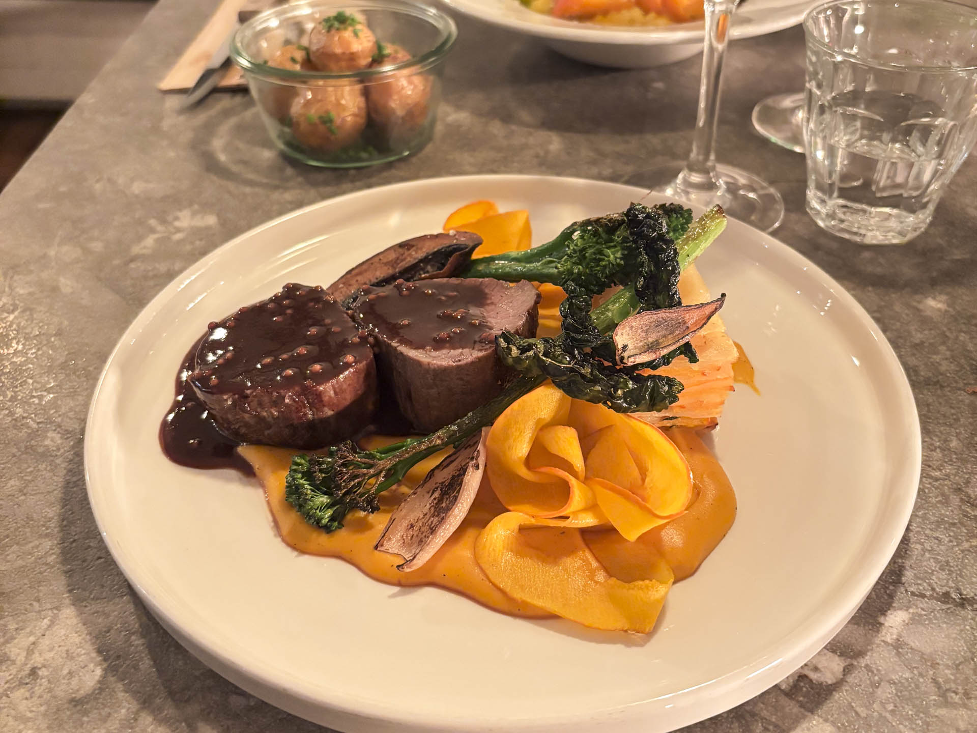 Pommes Annaen var klassisk udført: gylden, mør og med et tilfredsstillende bid. Det syltede græskar tilføjede en sød-syrlig friskhed, der klædte den dybe rødvinssauce glimrende.