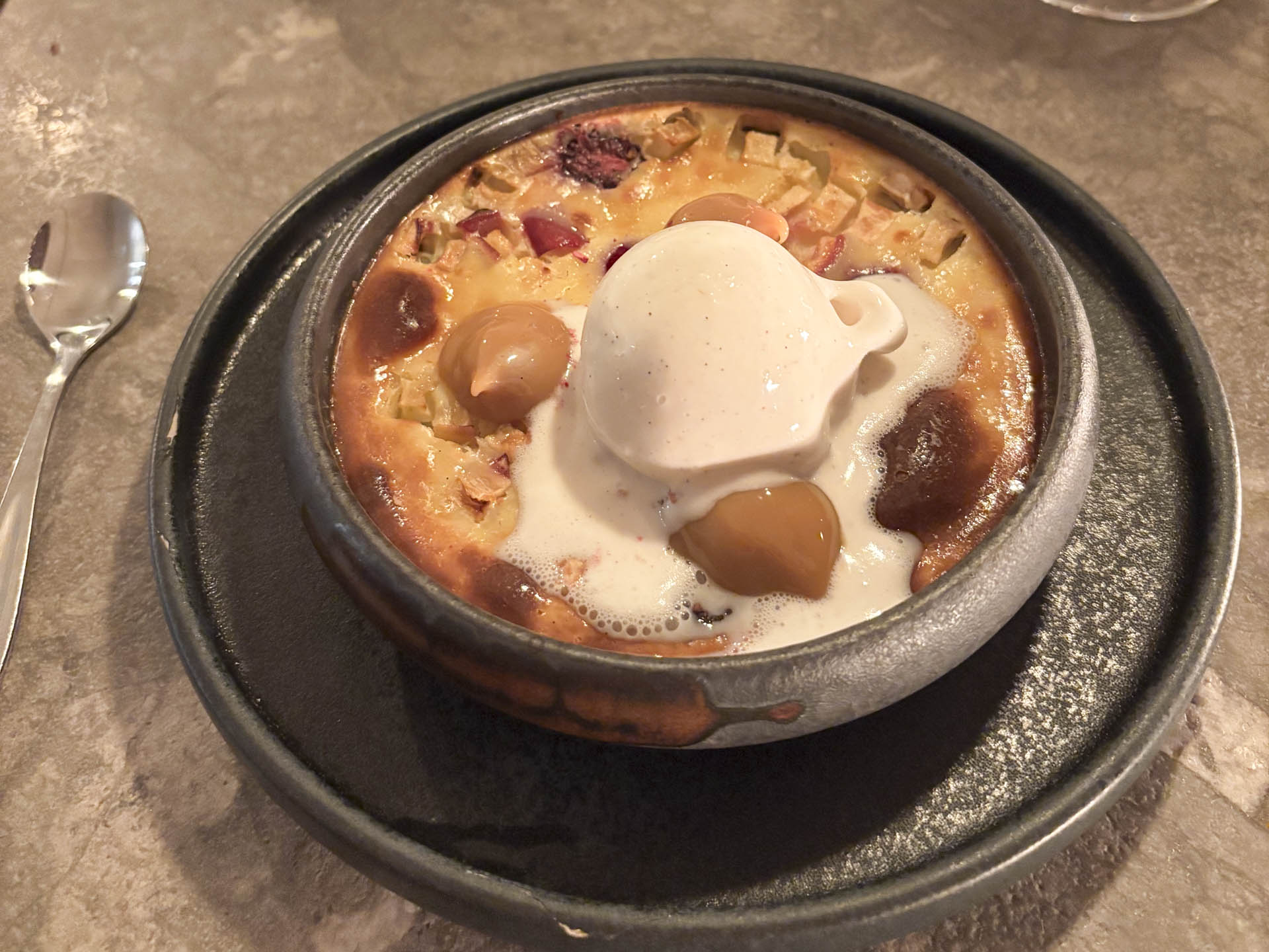 Desserten, en clafoutis med brombær, æble, karamel og vaniljeis satte et sødt punktum for menuen. Vaniljeisen var virkelig lækker, og selvom clafoutis’en rummede mange elementer, var det en god afslutning på måltidet.
