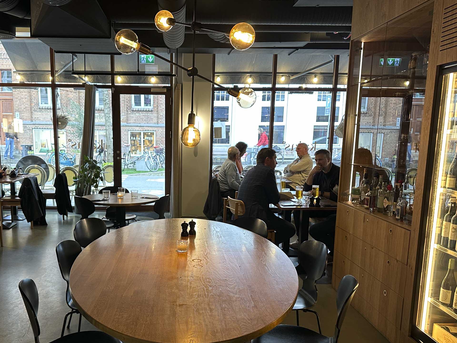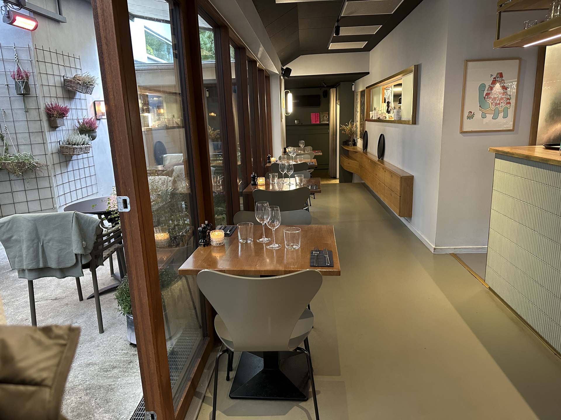 Da vi trådte indenfor, blev vi mødt af en moderne og nutidig restaurant og en venlig tjener, der uden ståhej viste os til bords. Stemningen var rolig og uhøjtidelig med akustisk musik i baggrunden og god plads mellem bordene. En indretning og atmosfære, der fik skuldrene til at falde ned. Helt ned.