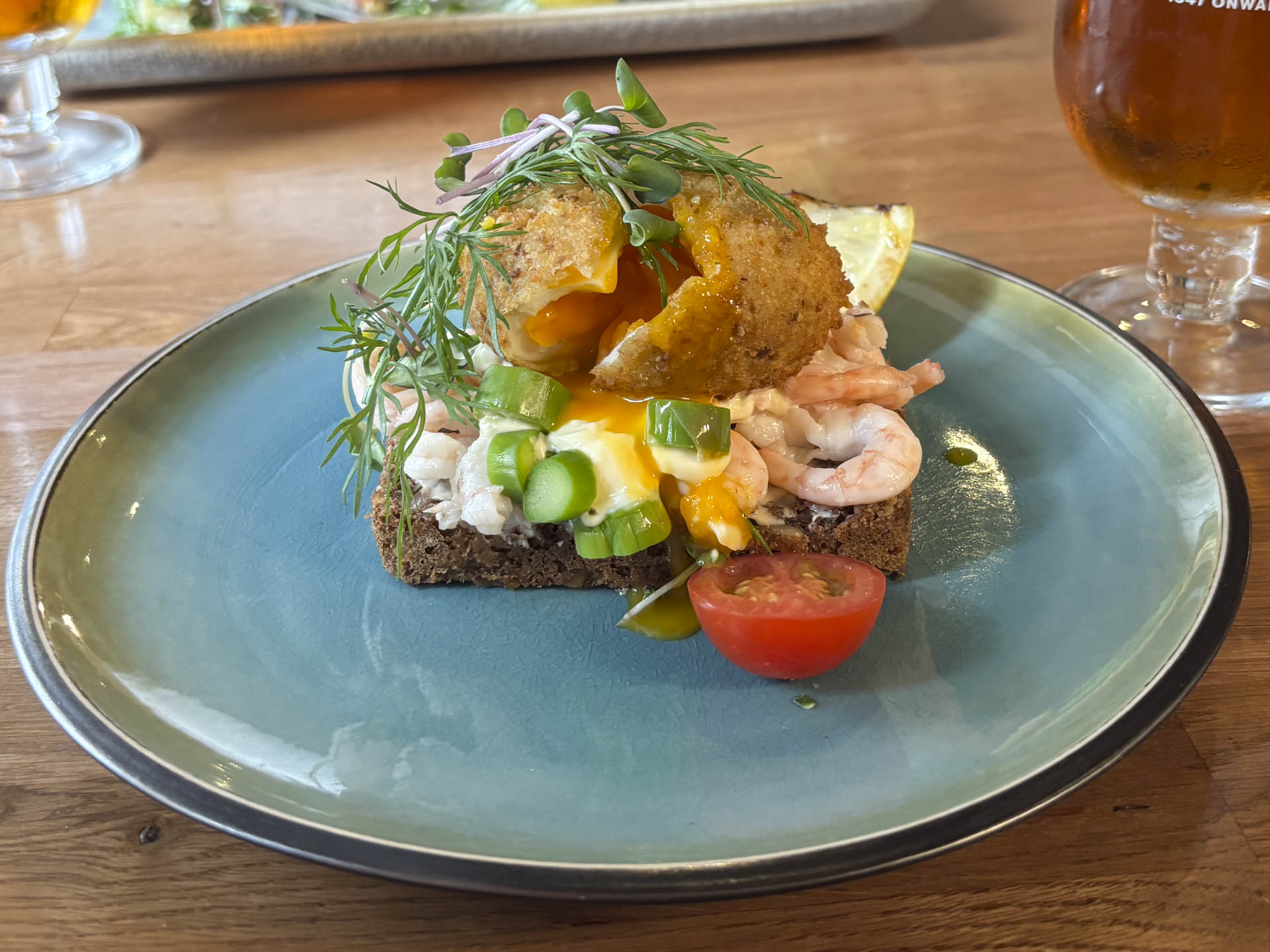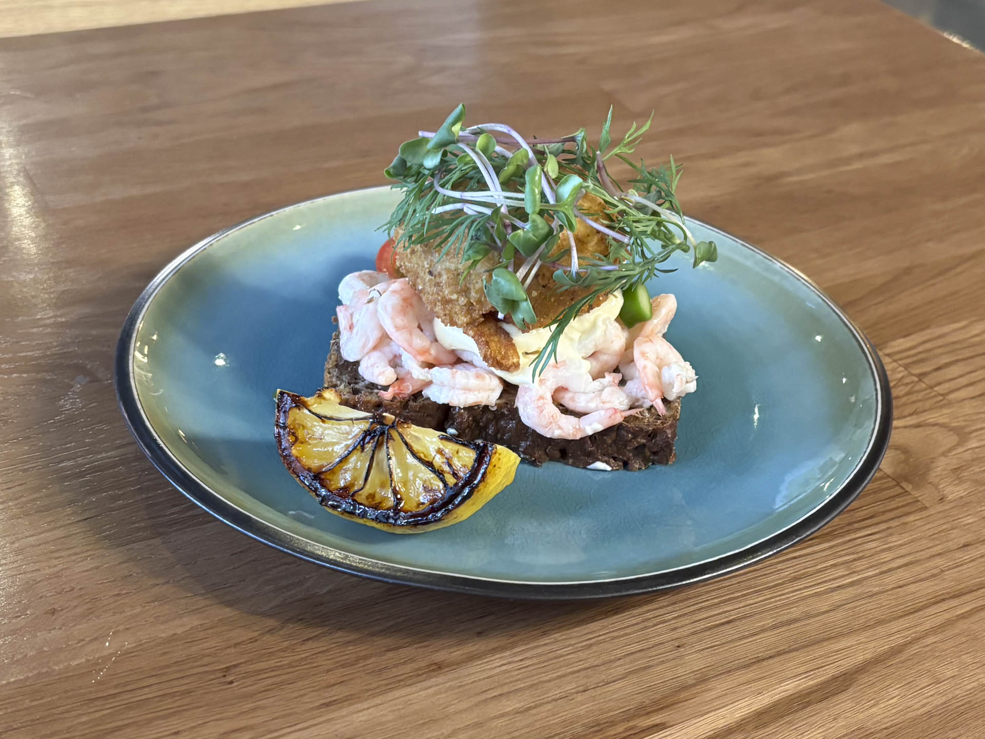 Smørrebrødet med rejer og friteret æg var lige så ukompliceret, som det var vellykket. Det var et enkelt stykke, der fremstod flot på den blålige tallerken. Rugbrødet var frisk, tykt skåret og smurt med smør. Ovenpå lå rejerne. De var pænt store, faste og havde god smag. Det friterede æg åbnede sig, så den gule blomme blandede sig med rejerne. Igen var håndværket i orden.