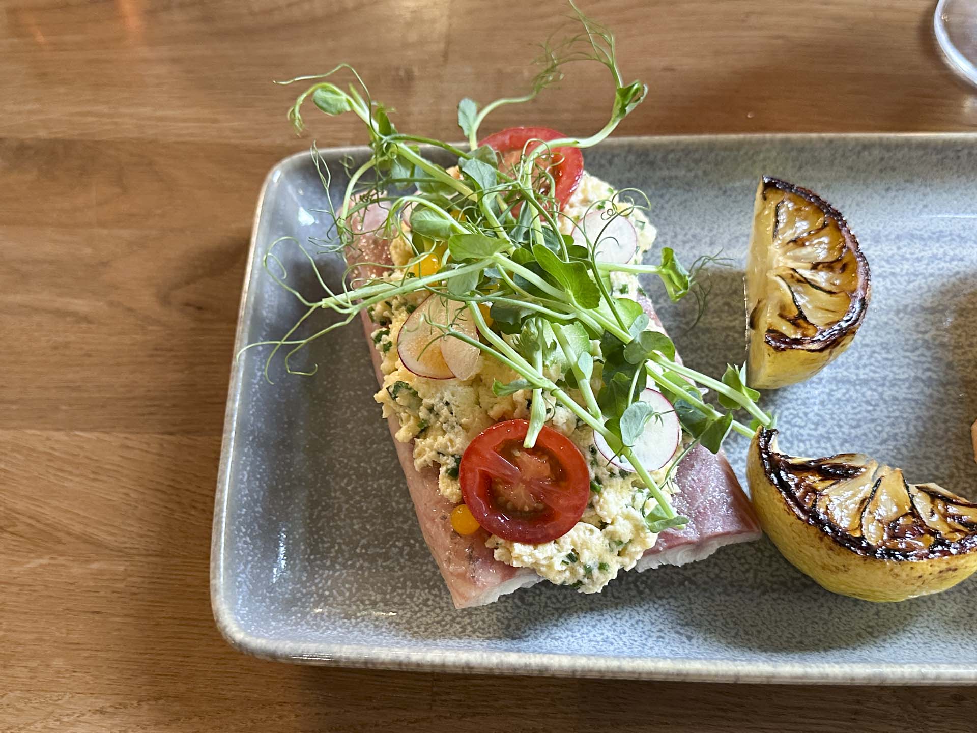 Da der var ål på kortet, måtte det prøves. Her var det igen et stort stykke på et tykt stykke godt rugbrød. Ålen var i tykke, saftige stykker med fyldig smag, naturlig sødme og en let saltet undertone. Røræggene med urter var cremede og i en perfekt konsistens. Ikke for tørre og ikke for våde. Skiver af radiser, tomater, skiver af grønne asparges, gule rogn, grillet citron samt grønt på toppen var med til at fuldende stykket.