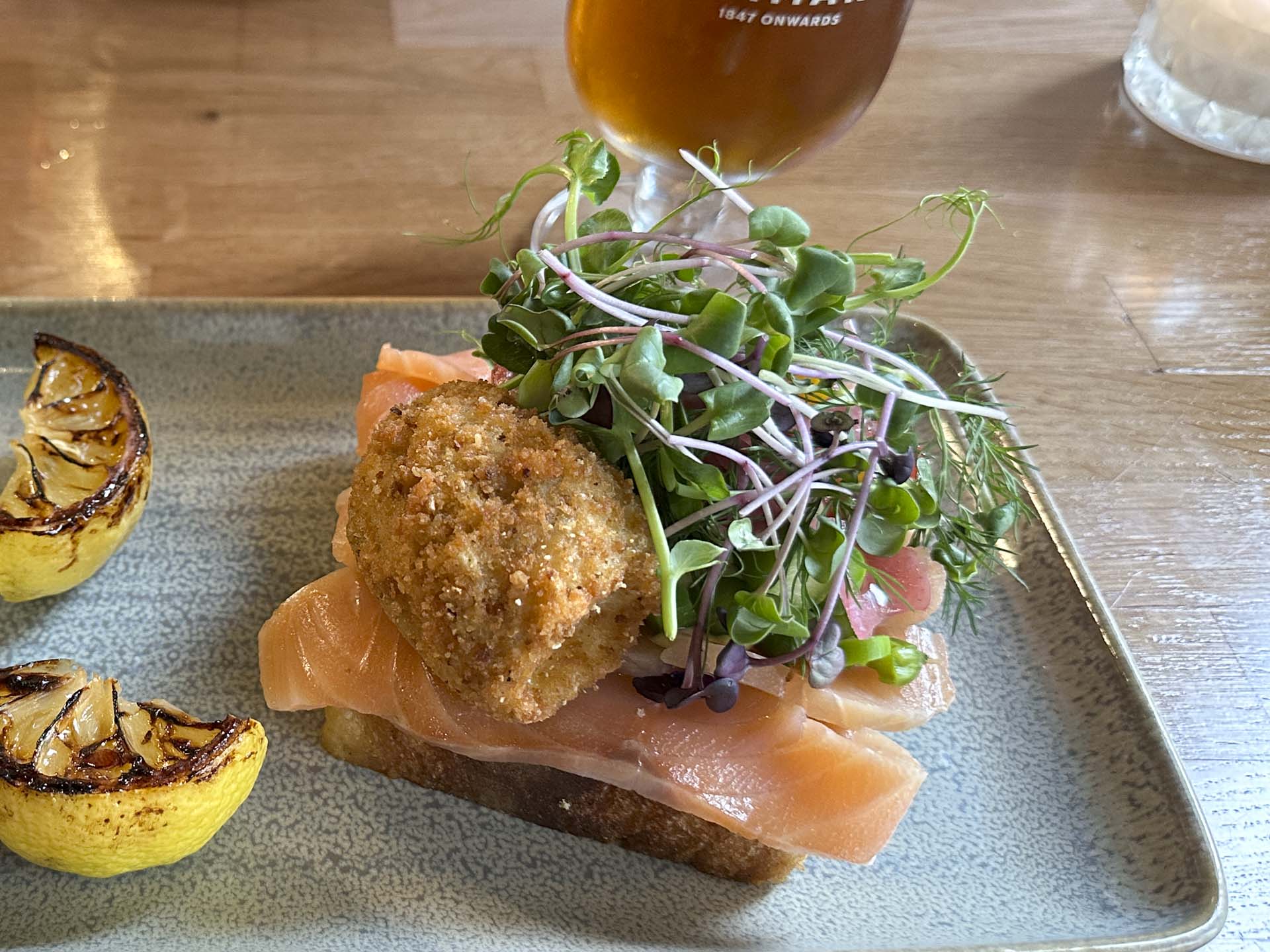 Det friterede æg var perfekt tilberedt. Da kniven brød den sprøde overflade, væltede den flotte gule blomme ud og blandede smagene sammen. De syltede rødløg var sprøde og syrlige uden at overtage smagen. De gav et præcist spark til resten. Små tomater og sprøde skiver af grønne asparges havde også sneget sig med, sammen med det grønne pynt, og en grillet citron.