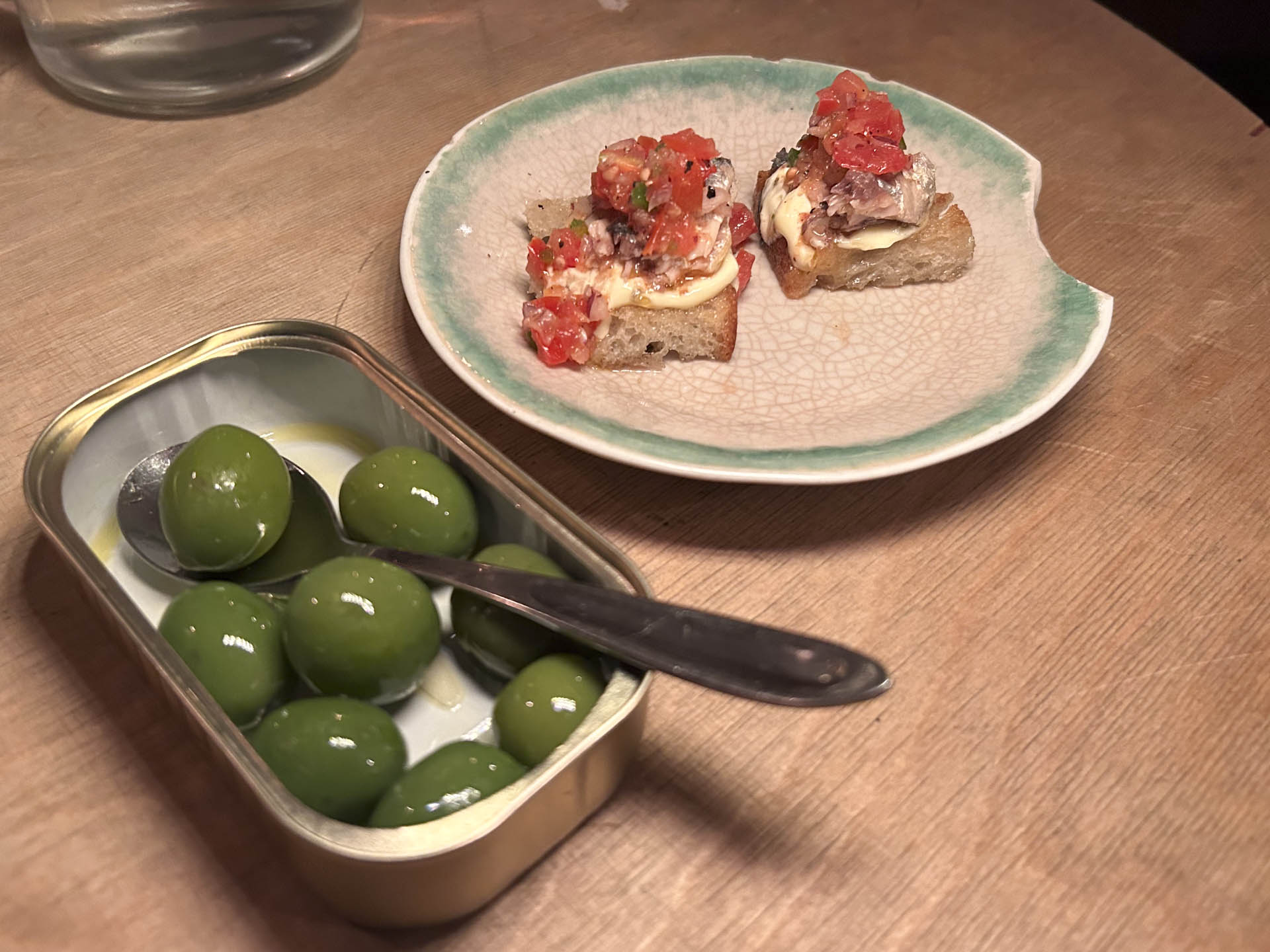 Lidt efter slog køkkenet an med snacks; to hapsere bestående af grillet brød med sardiner, pico de gallo (friskhakket tomatsalsa) og mayonnaise lavet Kewpie-style. En fremragende bid, der blev båret frem af en sublim olivenolie, som koncernen bag Masvino selv importerer.