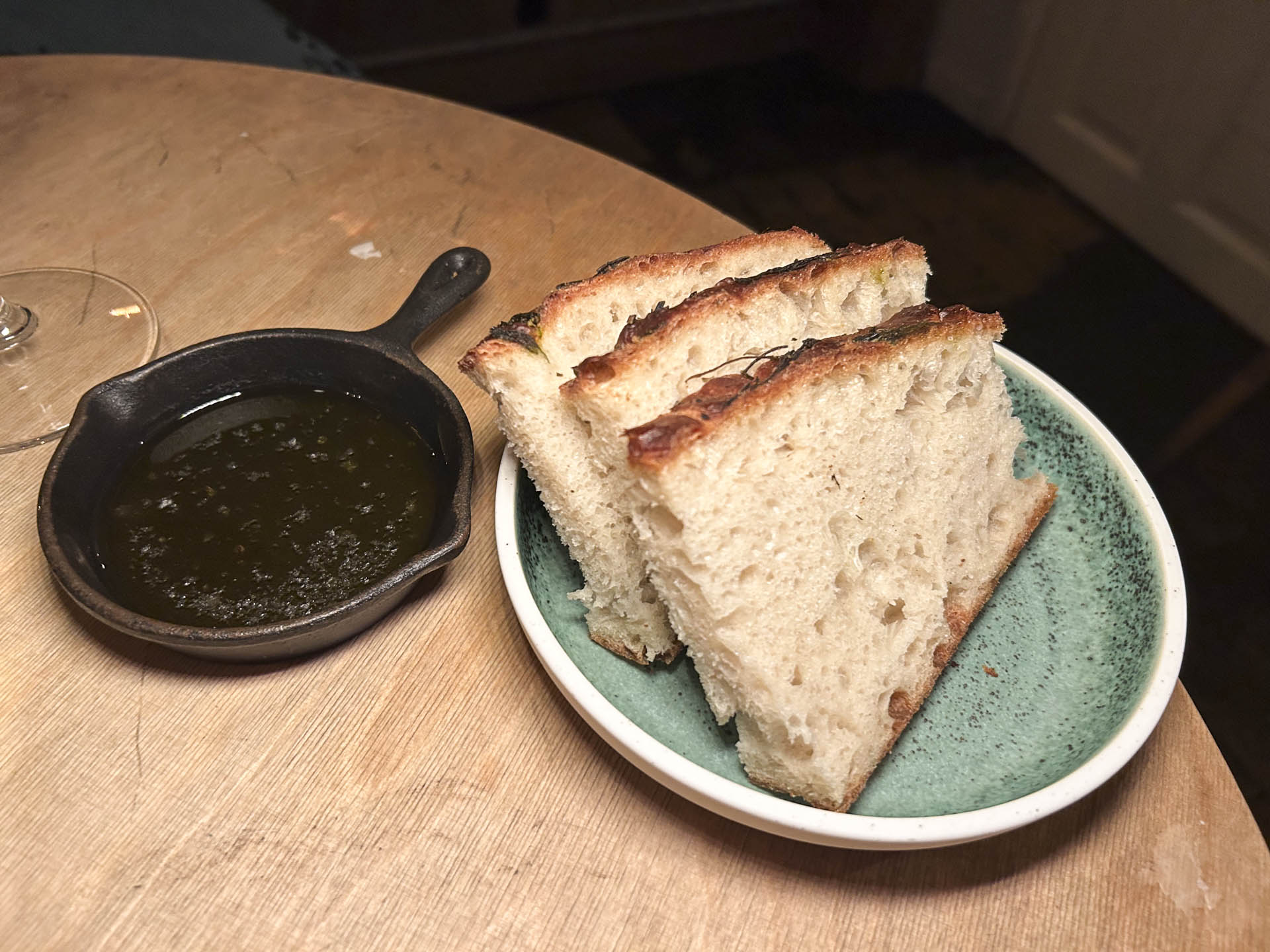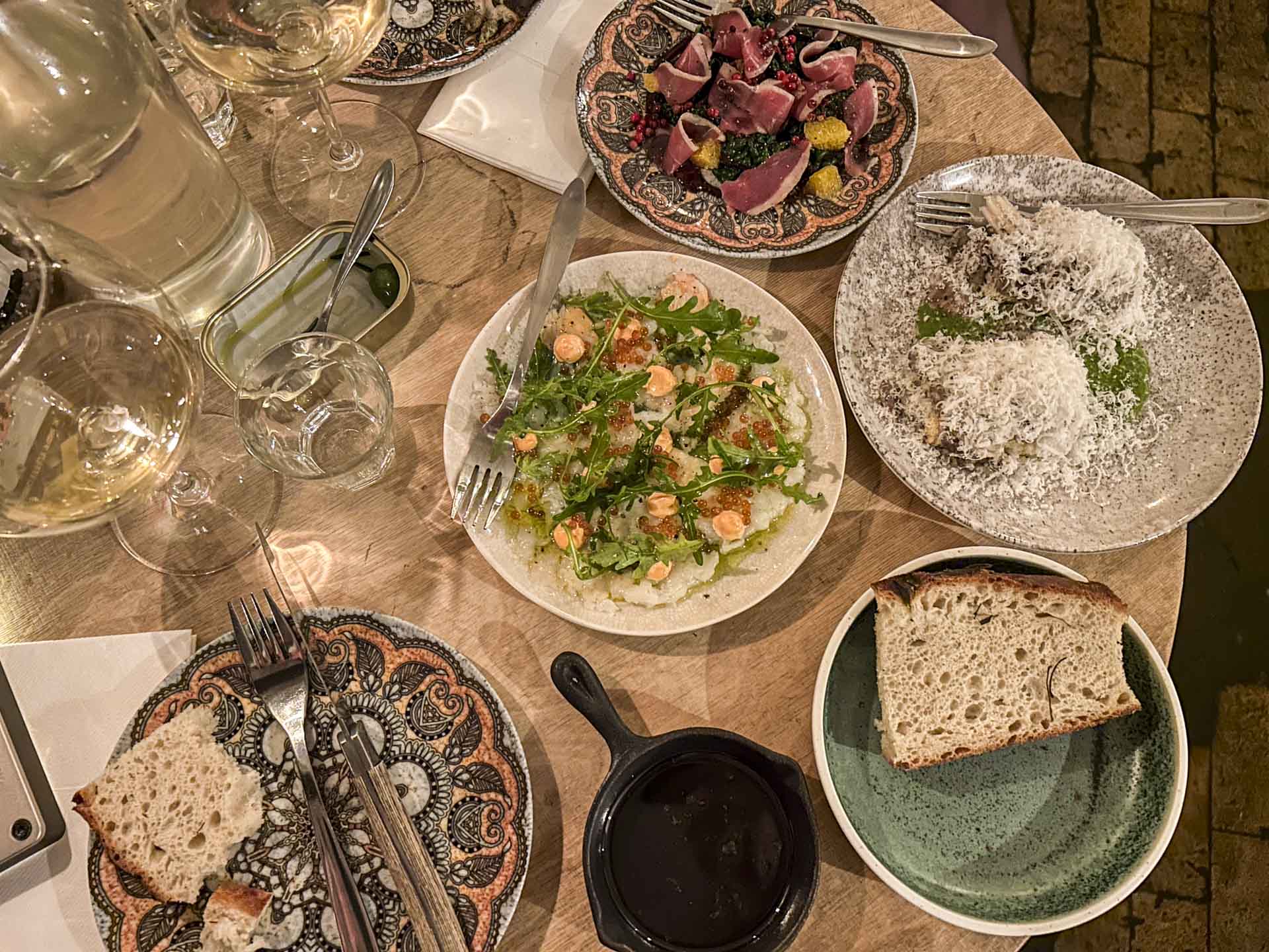 Sammen med maden kom hjemmebagt brød med urter, og brødet gav ny mening til ordet svampet og sugede god olivenolie til sig uden problemer.