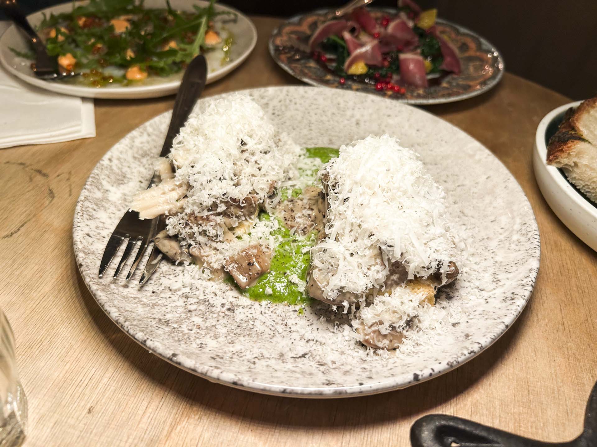 Nu fandt første runde mad vej til bordet. Et par parmesandækkede svampetoasts havde fundet sig til rette på persillepuré, og det var med svampe a la creme som forbillede og jazzet op med syltede bøgehatte.
