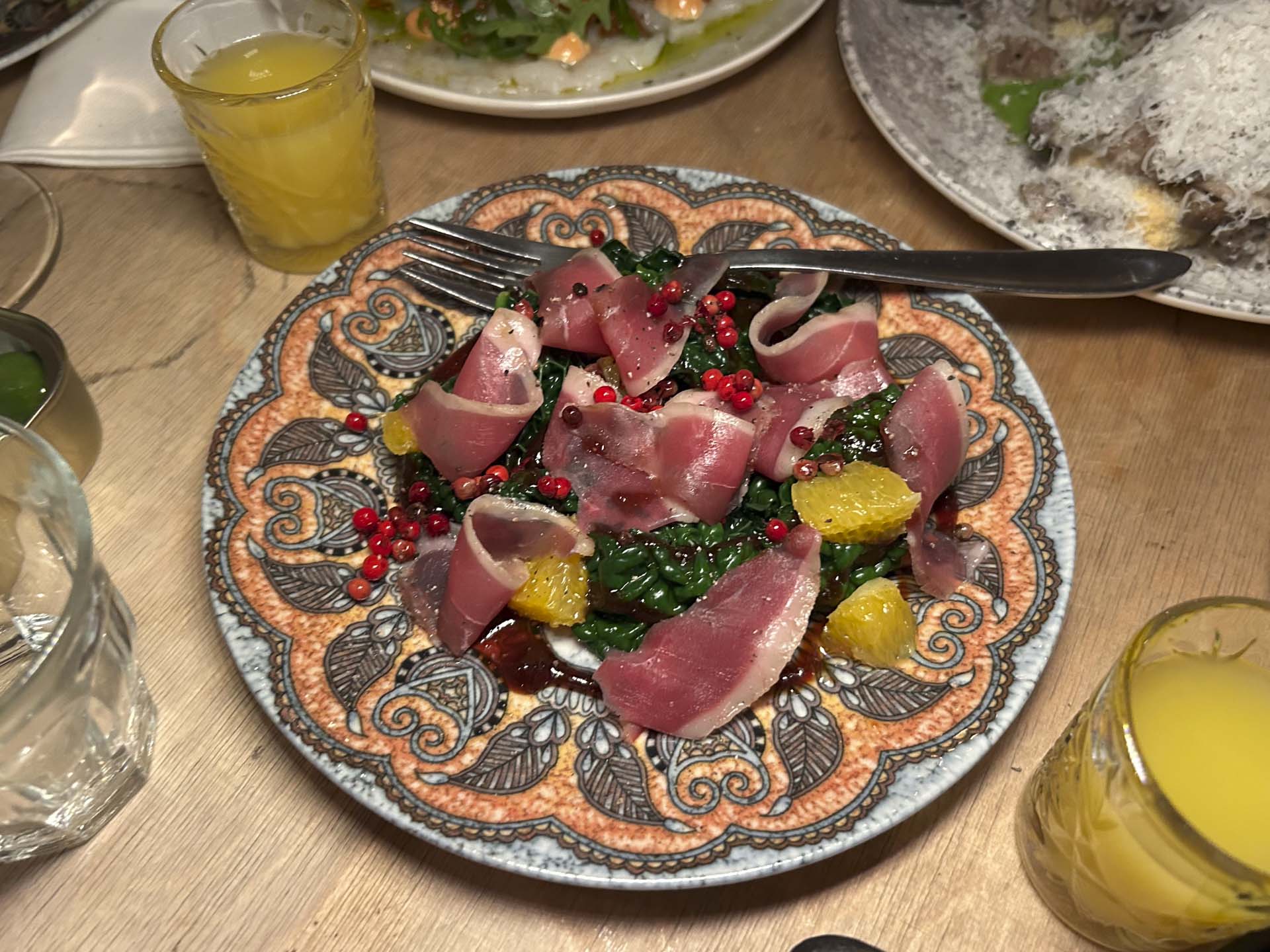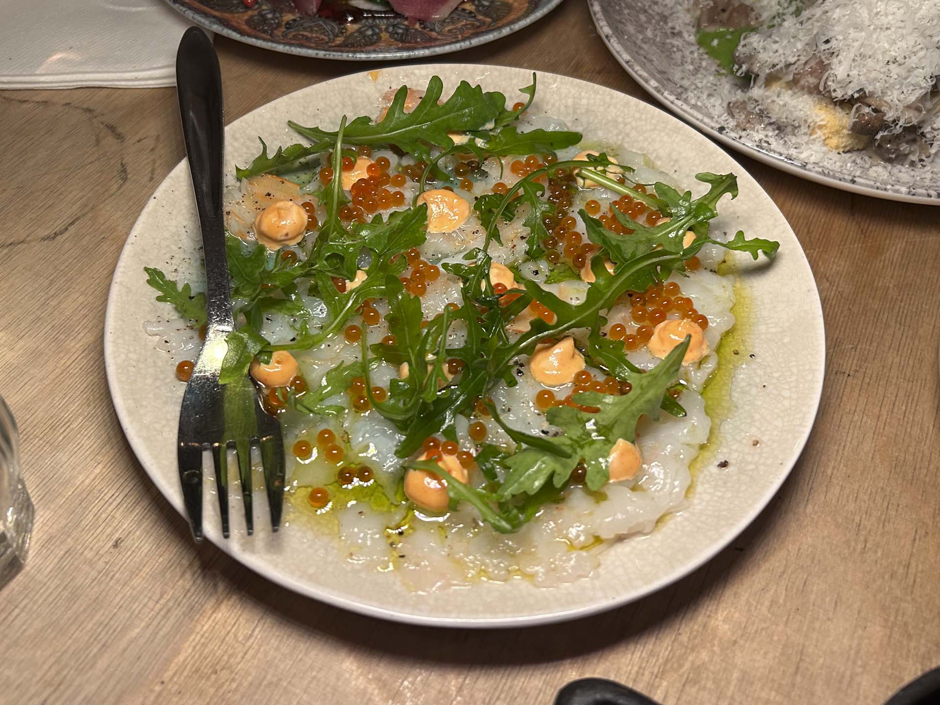 Rejerne blev præsenteret carpaccio-style og smagte intenst af både Middelhav og Asien. For første gang i lang tid gav rucola mening.