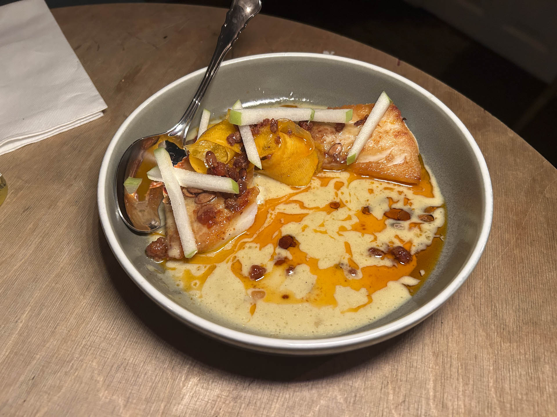 Med introduktionen af næste ret stod det klart, at køkkenet vil have smag frem i retterne. Hårdt stegt kuller, overhældt med n’duja under tilberedningen, mødtes med muslingesauce og syltede græskar.