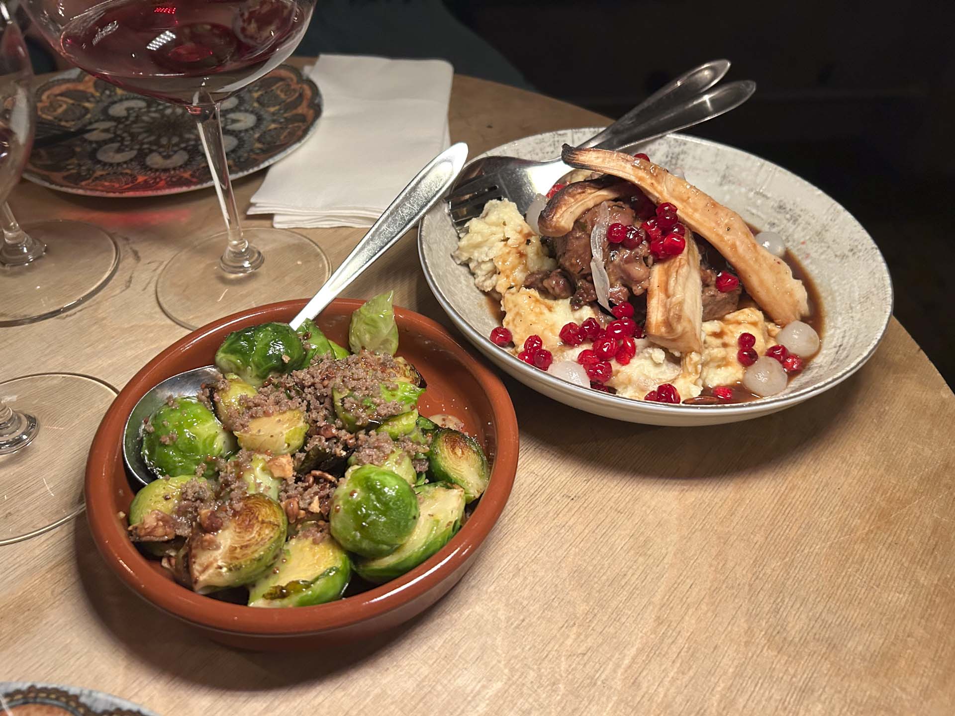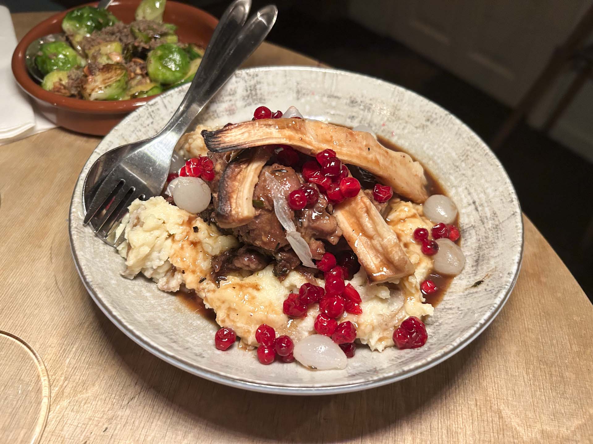 ’Neuf og nebbiolo kræver sin mad, og nu blev det vinter på tallerkenen. En stor portion (læs: rigeligt til to) rødvins- og sherrybraiserede svinekæber kom på et leje af grov kartoffelmos med syltede tyttebær, perleløg og persillerod.