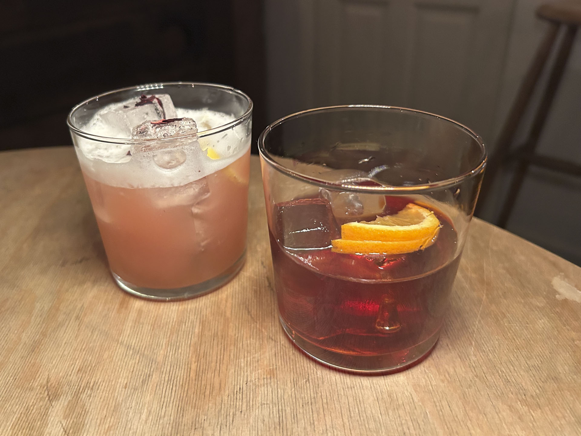 På Masvino laver de også deres egne cocktails, alle til den retfærdige pris 95 kr., og vi tog derfor en pause før desserten med Marianito og hibiscus-infuceret Bee’s Knees. Begge cocktails var velbalancerede, til den venlige side, og smagte godt.