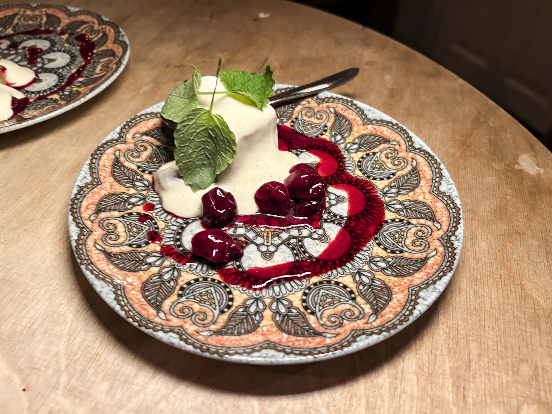 Sæsonens dessert var, hvad vi kan kalde en moderniseret risalamande. En kube mazarinkage, draperet med glinsende kirsebærsauce smagt til med rom og, ikke mindst, en luftig sabayonnesauce med vanilje og hvidvin. Kompromisløst dejligt og i helt rette portionsstørrelse.