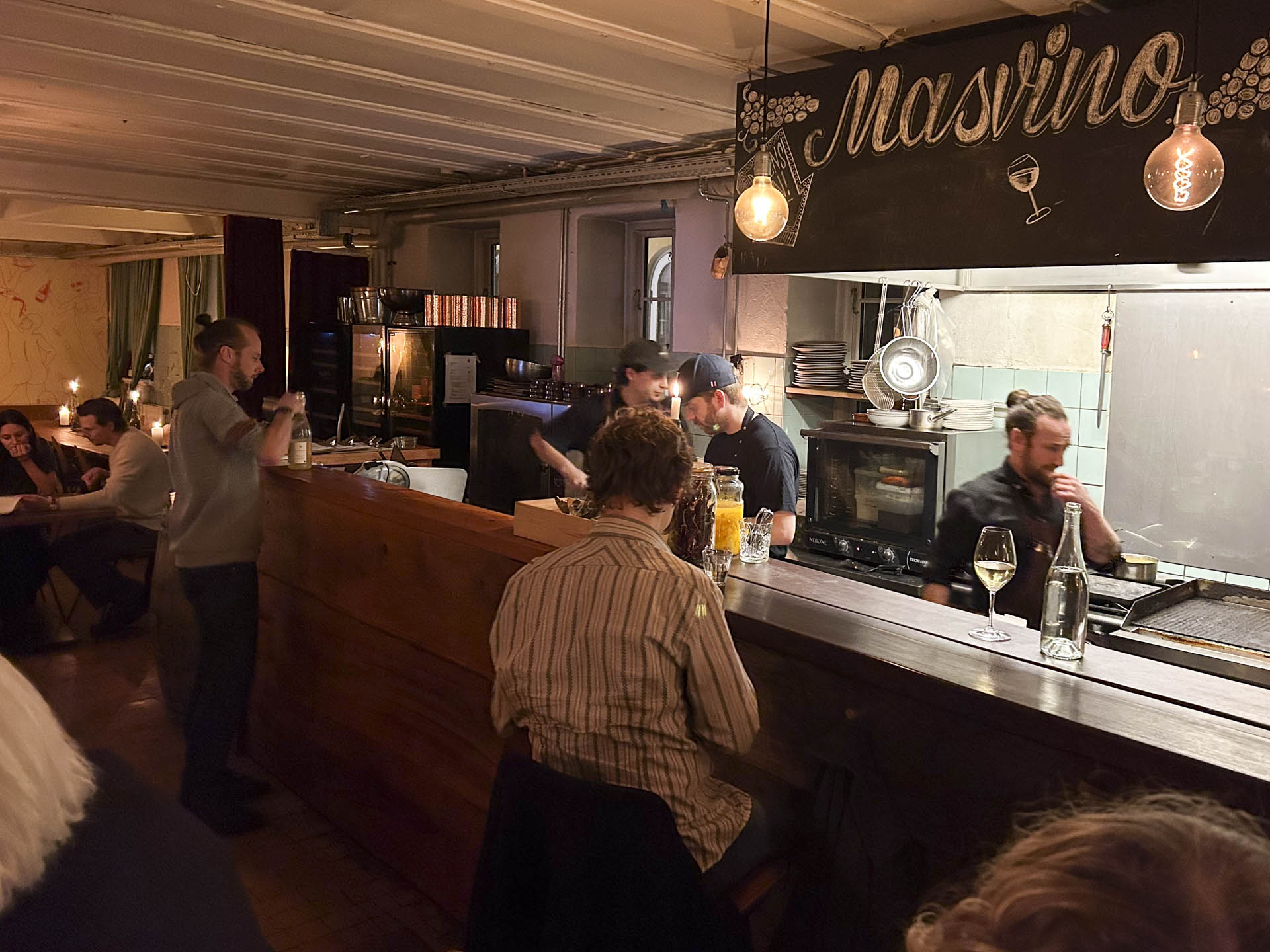 - Vinkortet er tiltalende, hvad enten man er til det klassiske eller avantgarde, og Masvino er afgjort blandt barerne med de mest interessante sortimenter af naturvin i byen. Og de har ikke bare et godt flaskekort, men serverer også en hel del på glas til fornuftige priser. Her er noget for enhver; nørden som den uprøvede.