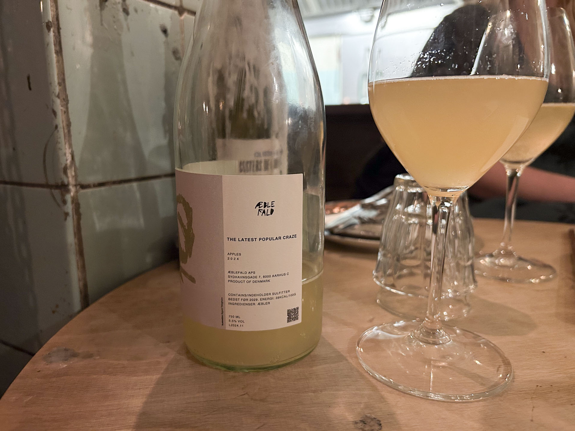 Til start fik vi serveret dansk æblecider fra den lokale producent, Æblefald. Her cuvéen ’The Latest Popular Craze’ på de meget syrlige Belle de Boskoop-æbler, mange nok kender fra andestegen til jul. Det var friskt og havde en behageligt perlende mundfølelse samt en lille snert af frugtig sødme.