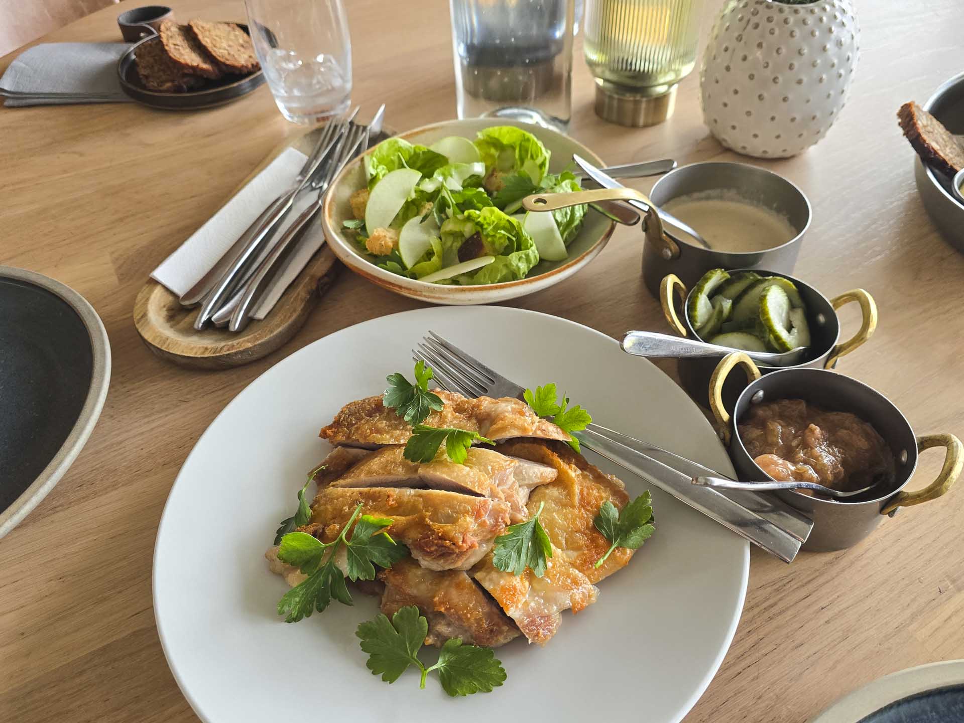 At det var en moderne udgave af kylling danoise, fortalte tilbehøret. Det var hjertesalat med æblevinaigrette, croutoner, frisk æble og persille i stedet for kartofler. Det fungerede fint og var alle tiders til frokost.