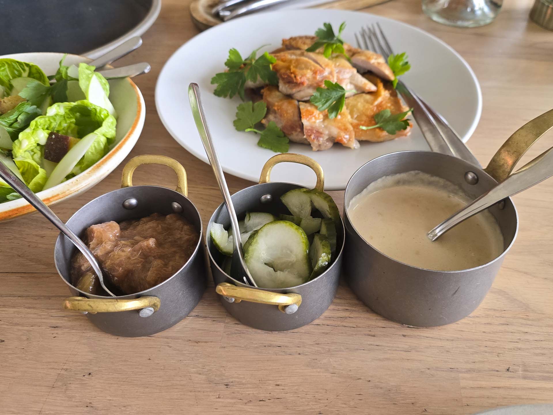 De syltede agurker var også hjemmelavede, sprøde og råsyltede. De kunne ikke laves bedre. Så enkle ting afslører ofte køkkenets niveau, og her var niveauet højt. Man sad næsten og tænkte, hvorfor agurker ikke altid smager sådan. En rieslingsauce med kyllingefond og hvidvin bandt det hele sammen