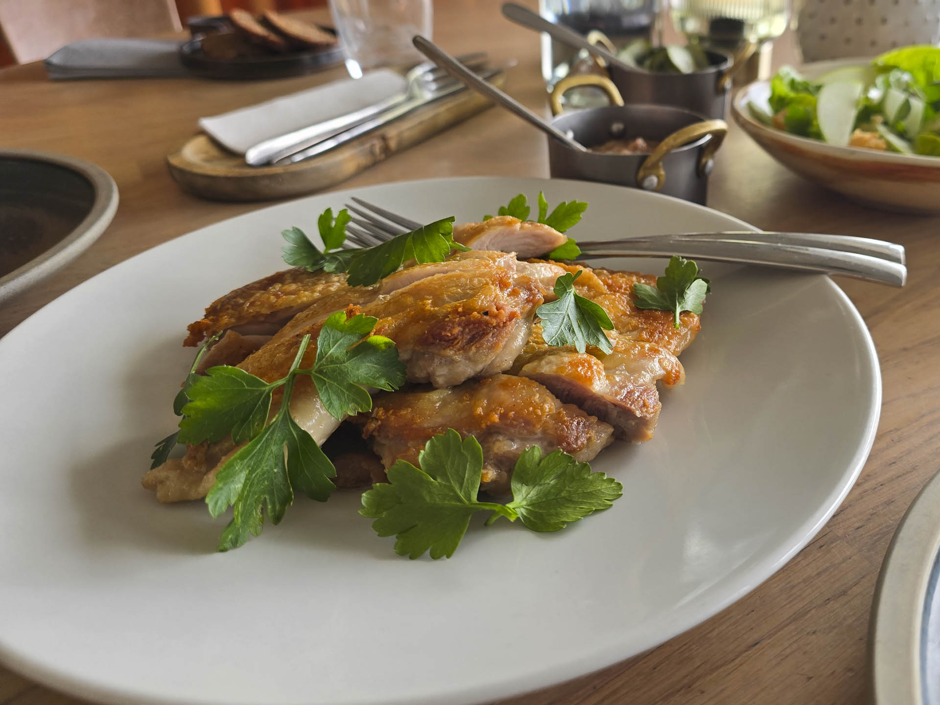 Kyllingen var ualmindeligt saftig og mør. Skindet var sprødt, og den smagte af noget, mere end tørt kyllingebryst normalt gør.