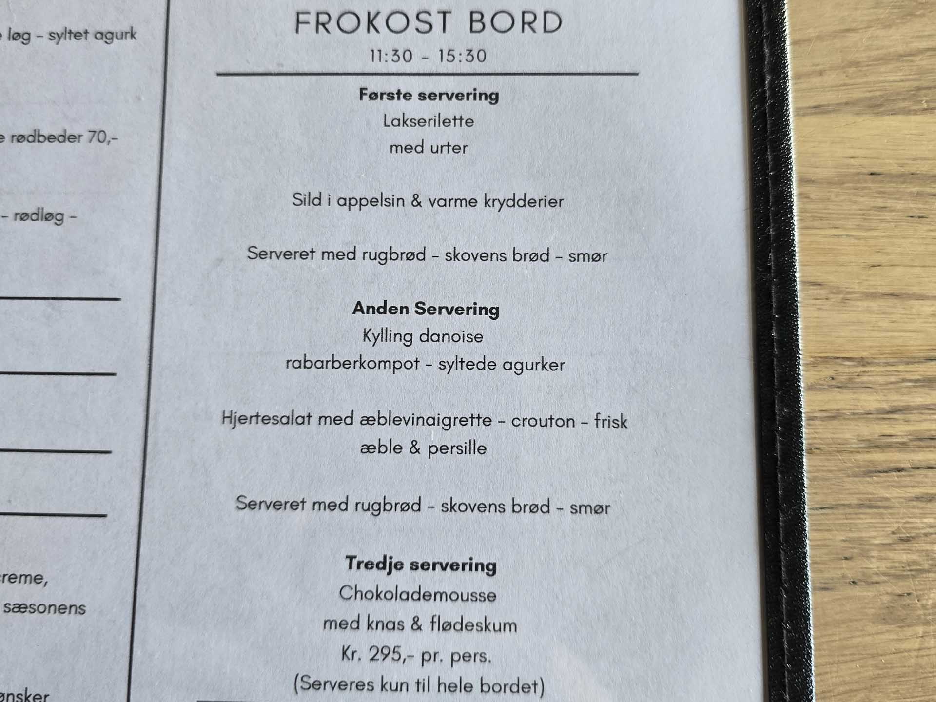Nu var det jo frokost, og smørrebrød er fast på frokostkortet. Det så også ud, som om det var efterspurgt her. Men dagens frokost endte med deres 3-retters frokostmenu til 295 kr., hvilket lød som en sympatisk pris. I øvrigt har de en fast frokostmenu i hele sæsonen, og menuen laves efter køkkenchefens humør og sæsonens råvarer.