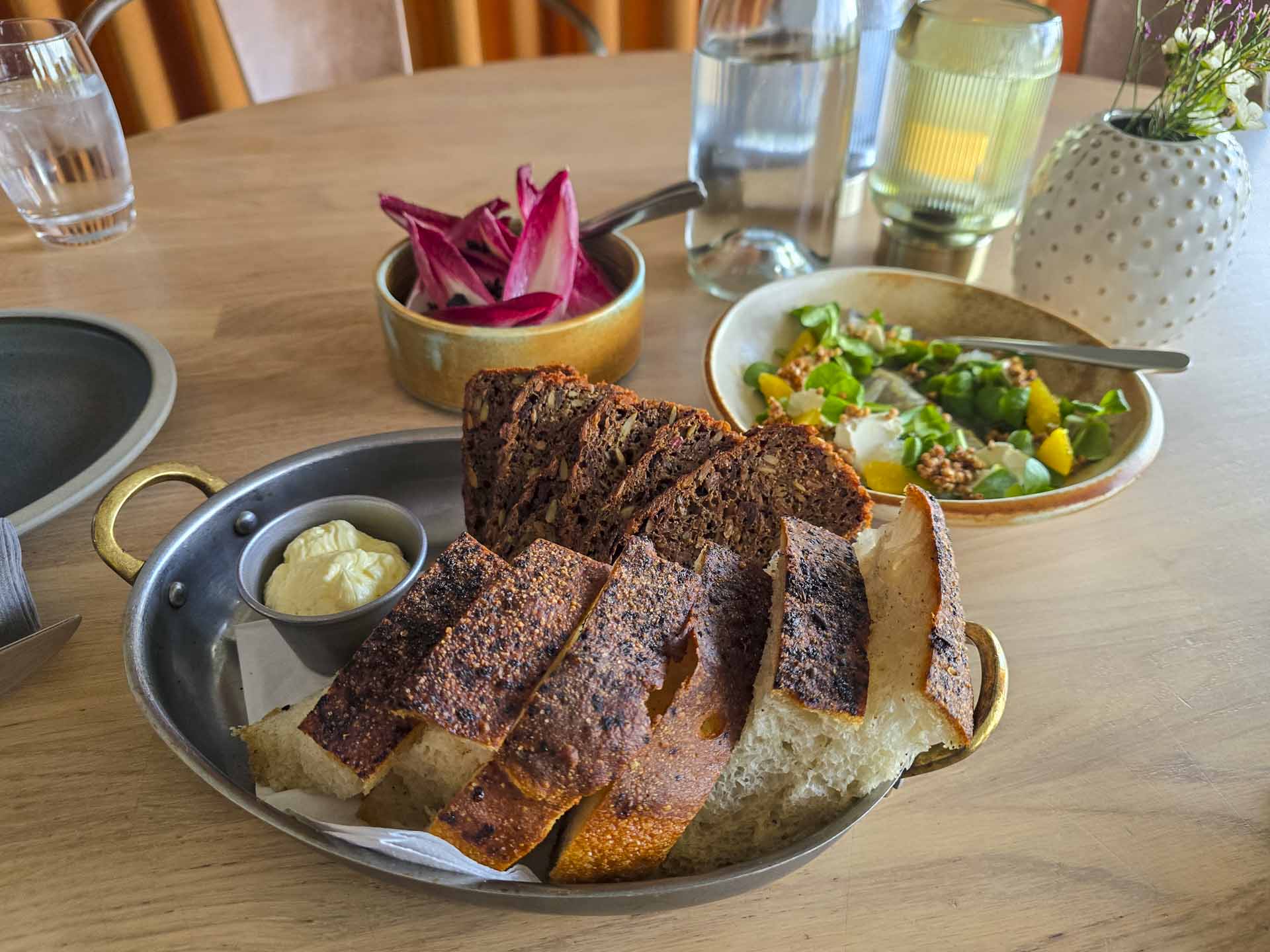 Under hele måltidet var der friskbagt surdejsbrød samt rugbrød til forretten plus smør.