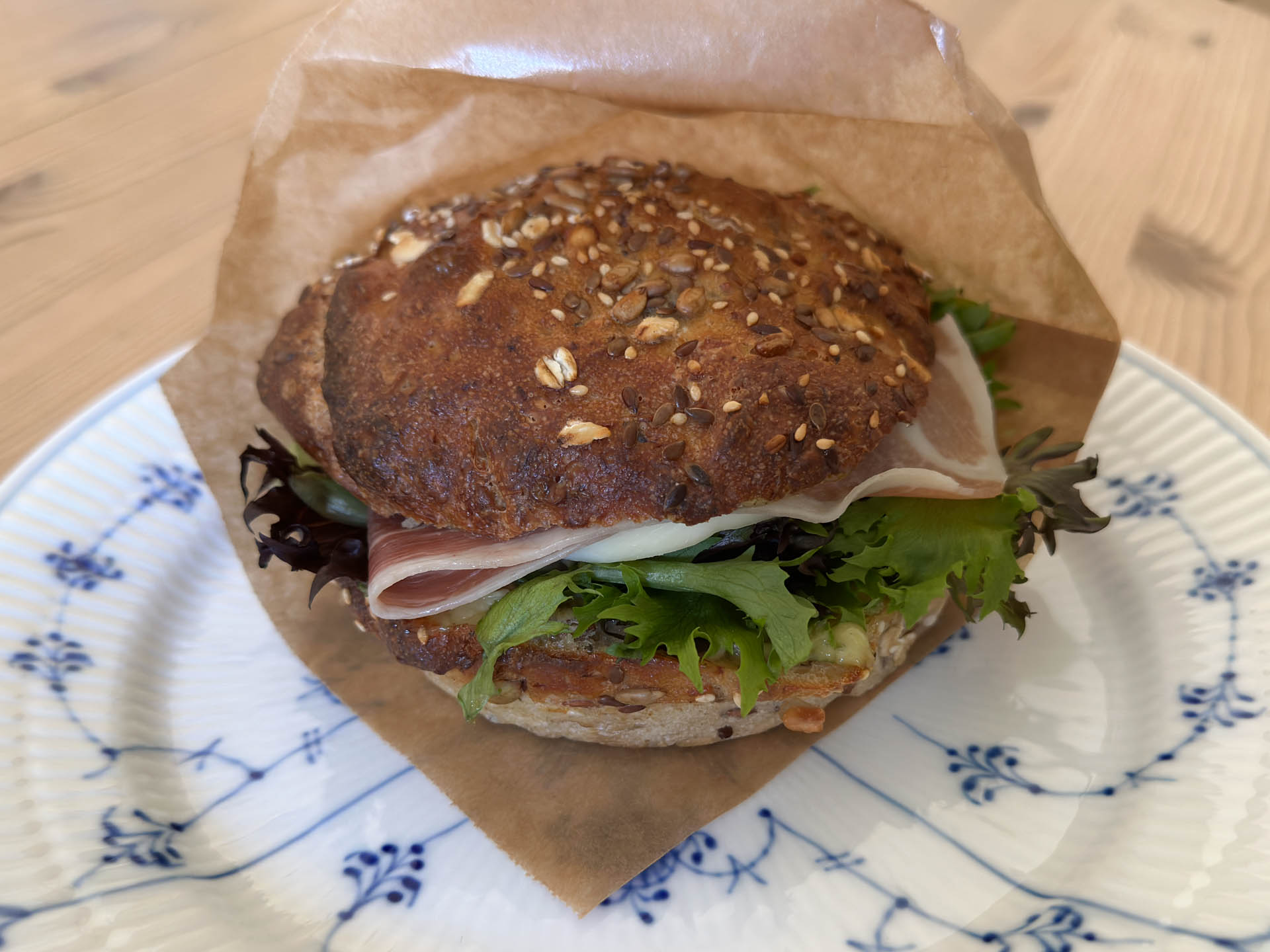Serranoskinke, mozzarella, soltørrede tomater, salat og pesto. Den gode grovbolle havde godt med gods i sig. Den holdt godt på fyldet. Her var der godt med serranoskinke i. Der var ikke sparet på den.