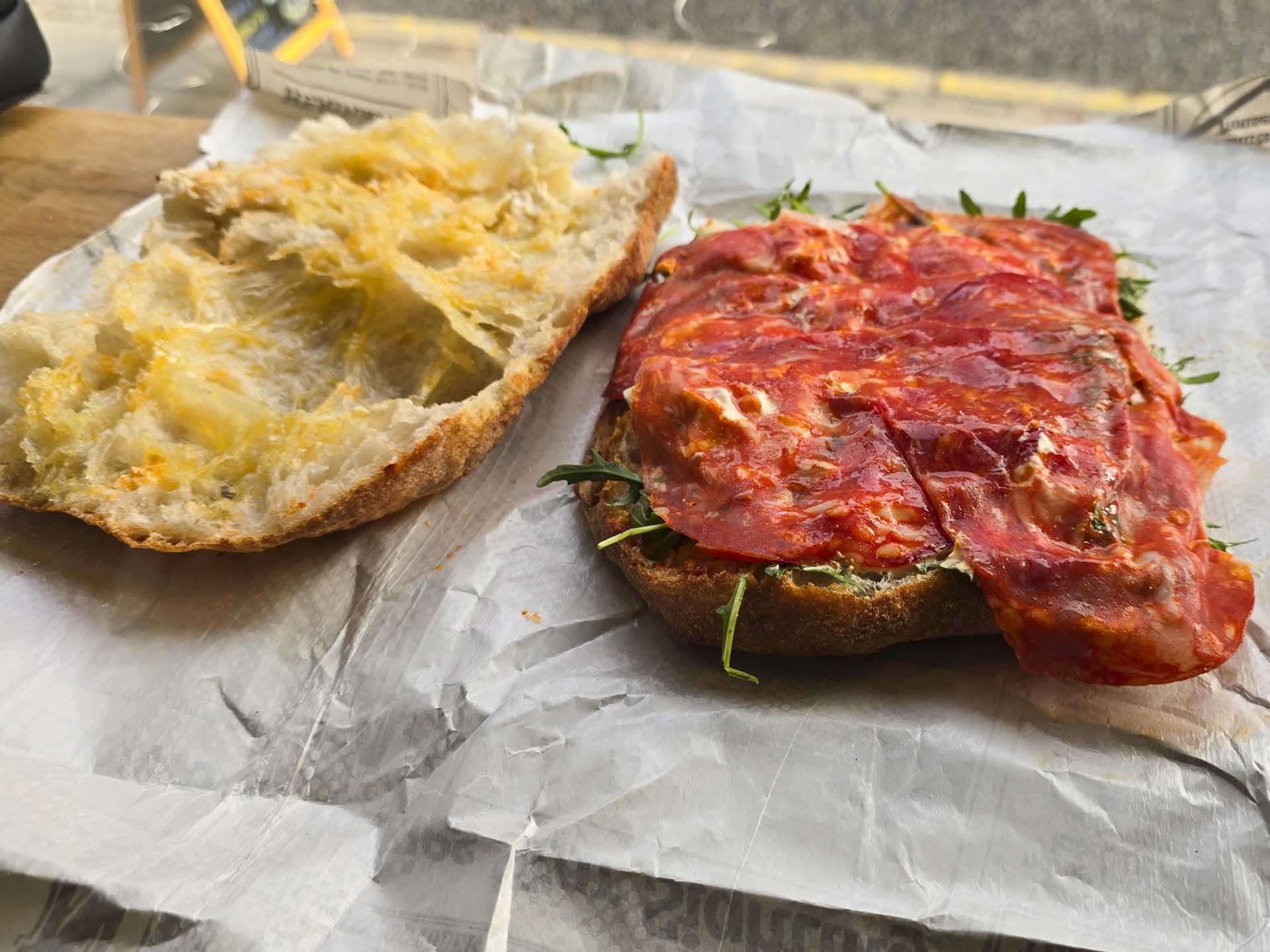 Brødet var lidt sprødt i skorpen, mere sej i krummen og gennemvædet af olivenolie og salt uden det blev for meget. Vores brød var lunt. Hos Toasted bager de løbende hele dagen, så man næsten altid får brød, der lige er kommet ud af ovnen.