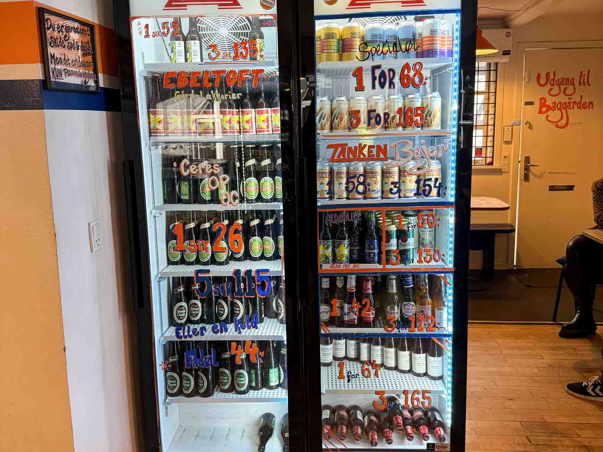 Her serveres skummende fadøl i et pænt tempo, men det er de bugnende køleskabe, der for alvor vækker opsigt. De indeholder alt fra den grønne klassiker til flasker for dem, der gerne vil nørde lidt med danske mikrobryggerier.