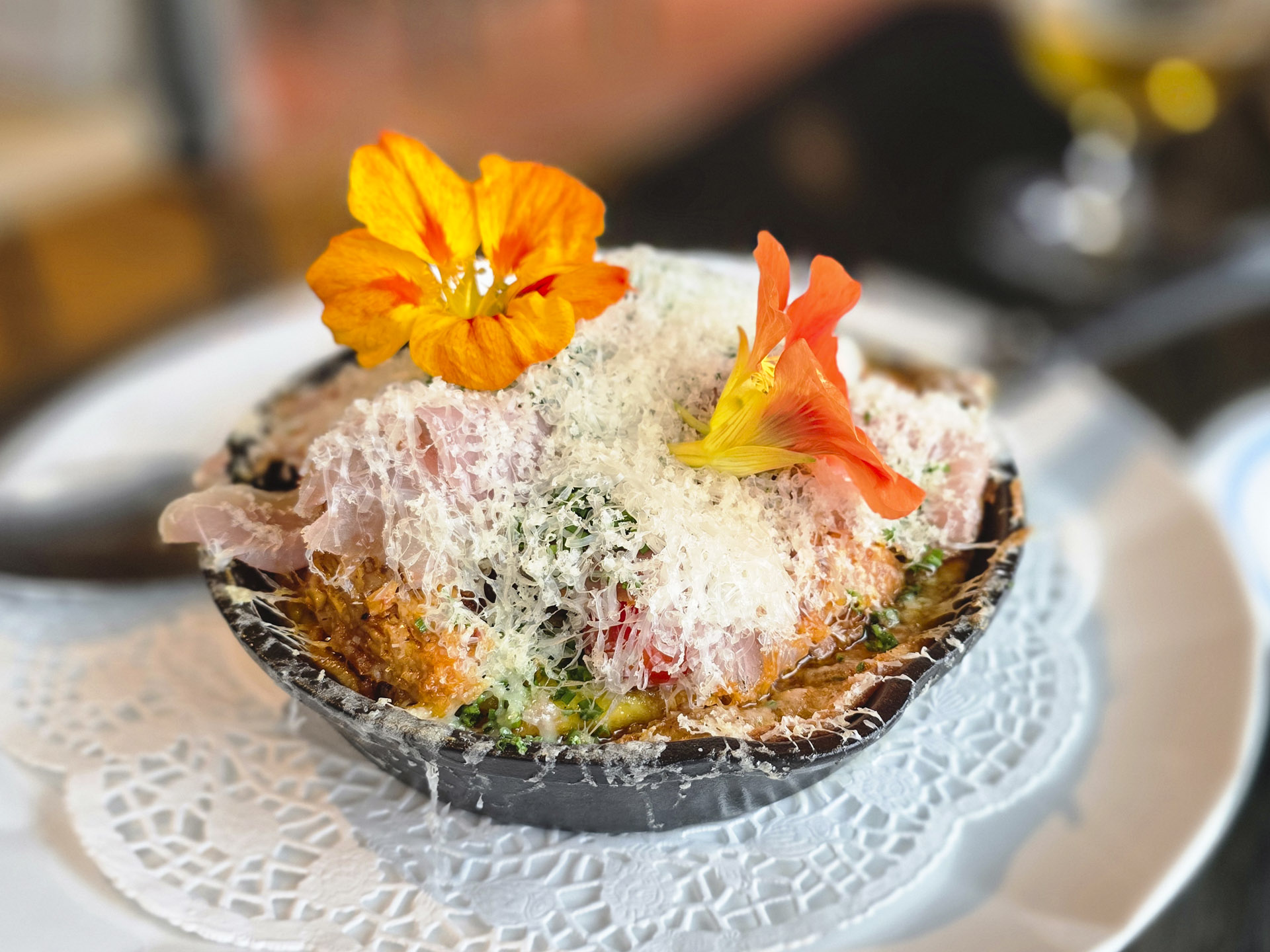 Fish’n’chips af dansk makrel fandtes også. Røget laks fra Samsø. En moderne æggekage med fynsk skinke, nduja og kantareller. Ligesom en fransk løgsuppe.