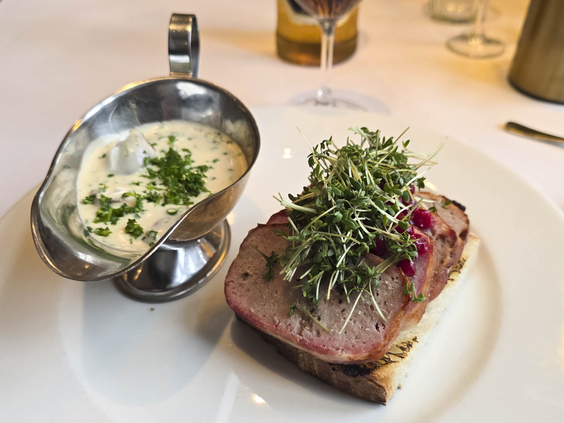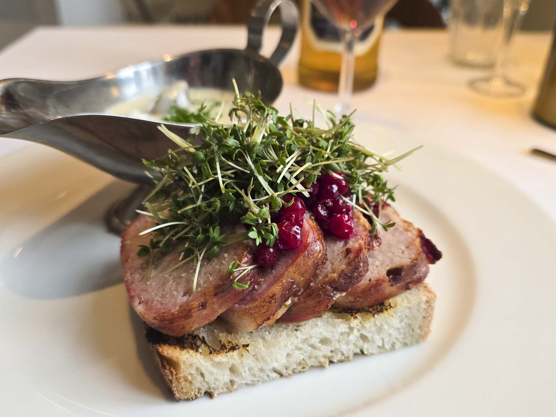 - Forloren hare på grillet surdej med andehjerter i flødesovs (178 kr.). Her var der for alvor nostalgi på drengen! Det er ganske enkelt det bedste stykke smørrebrød, vi har fået i meget lang tid. Helt genialt.