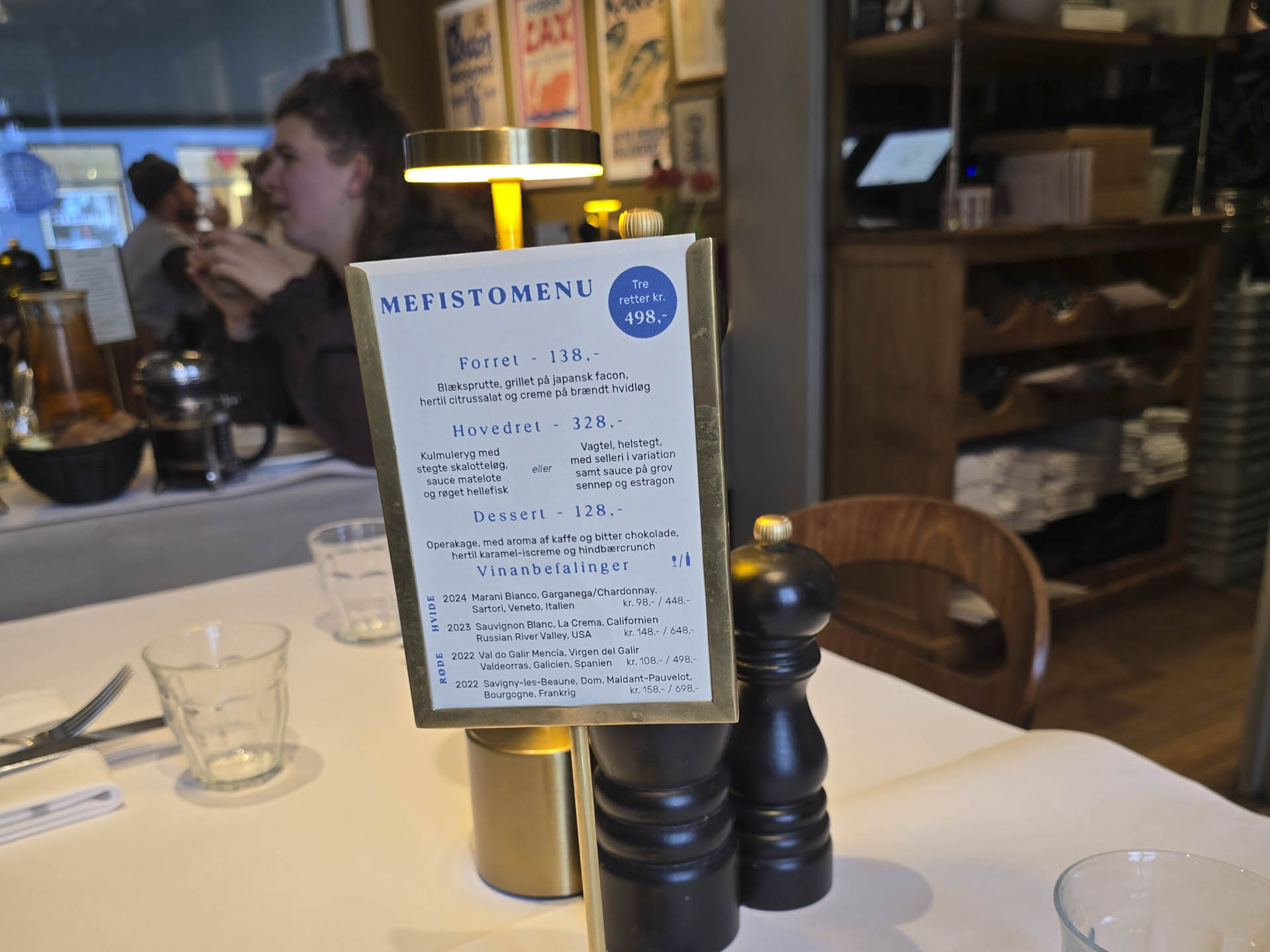 På Mefisto føles servicen som at træde ind i en svunden tid, på den bedste måde. Betjeningen er opmærksom, rolig og nærværende. Der er totalt styr på detaljerne, uden at det på noget tidspunkt bliver stift. Værtskabet er ganske enkelt fra øverste hylde, og det løfter hele madoplevelsen til noget særligt.