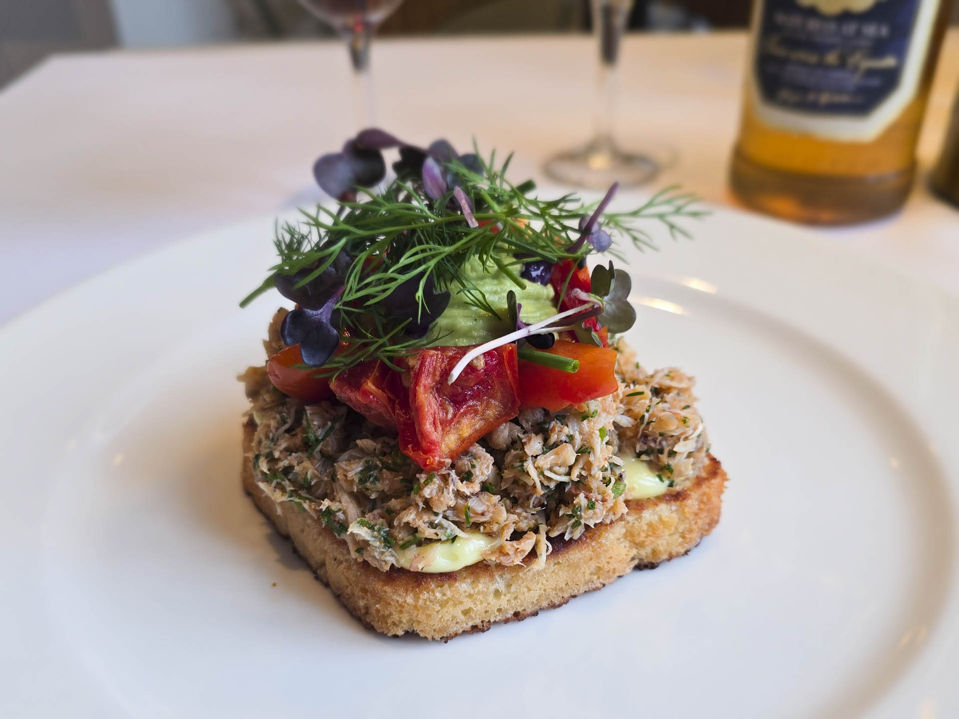 - Krabbesalat med avocado, syltede tomater og mild chili (168 kr.).
