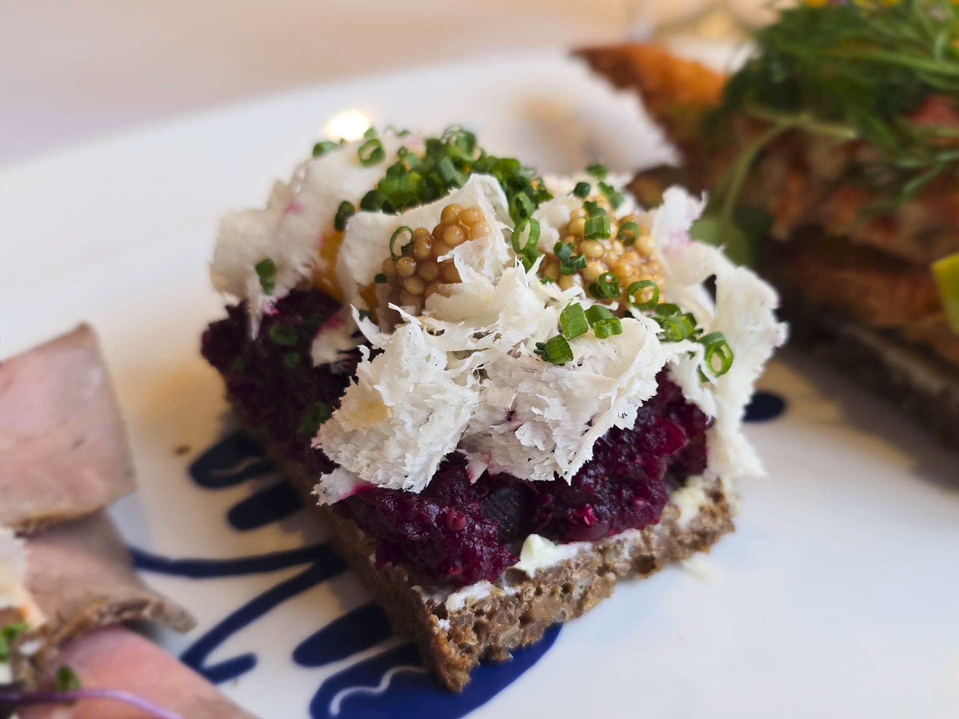 - Tatar af saltbagt rødbede med æggeblomme, sennep og peberrod. Et fremragende bevis på, at grønt smørrebrød har sin berettigelse.