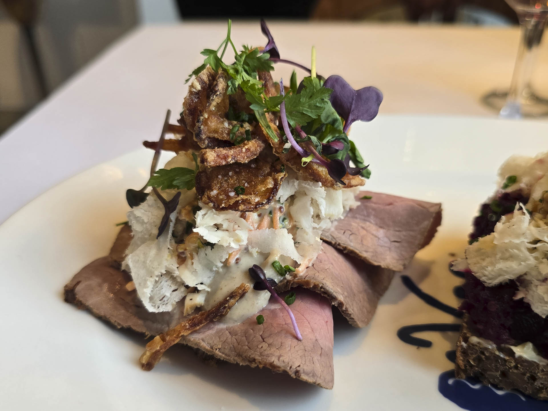- Roastbeef med Karl Johan creme, sprøde løg, sennepssyltede gulerødder og peberrod.