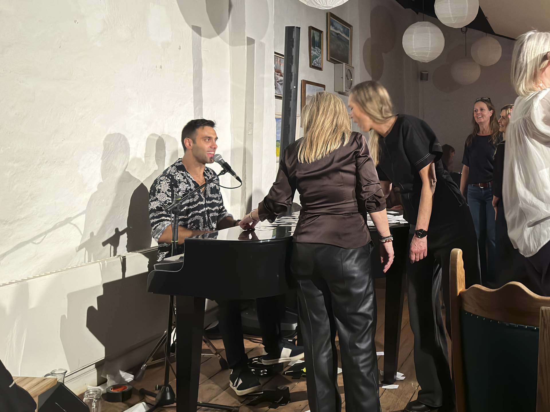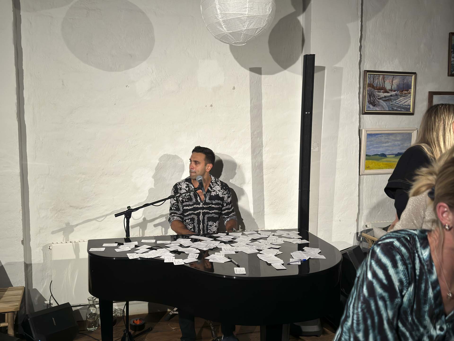Inden start kom han rundt ved hvert bord med ønskesedler. Han var imødekommende, smilende, og havde et nærvær, der gjorde det naturligt at skrive et ønske. Ønskesedlerne blev lagt på flyglet, og så begyndte aftenen for alvor.