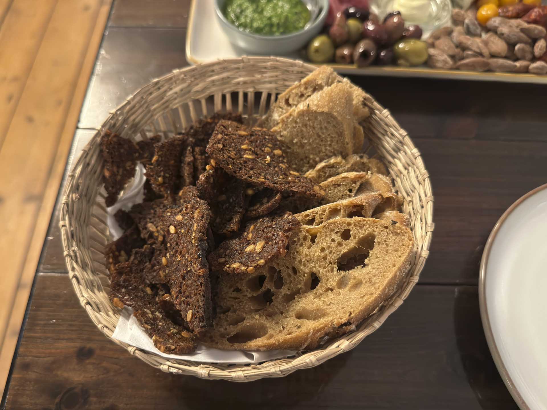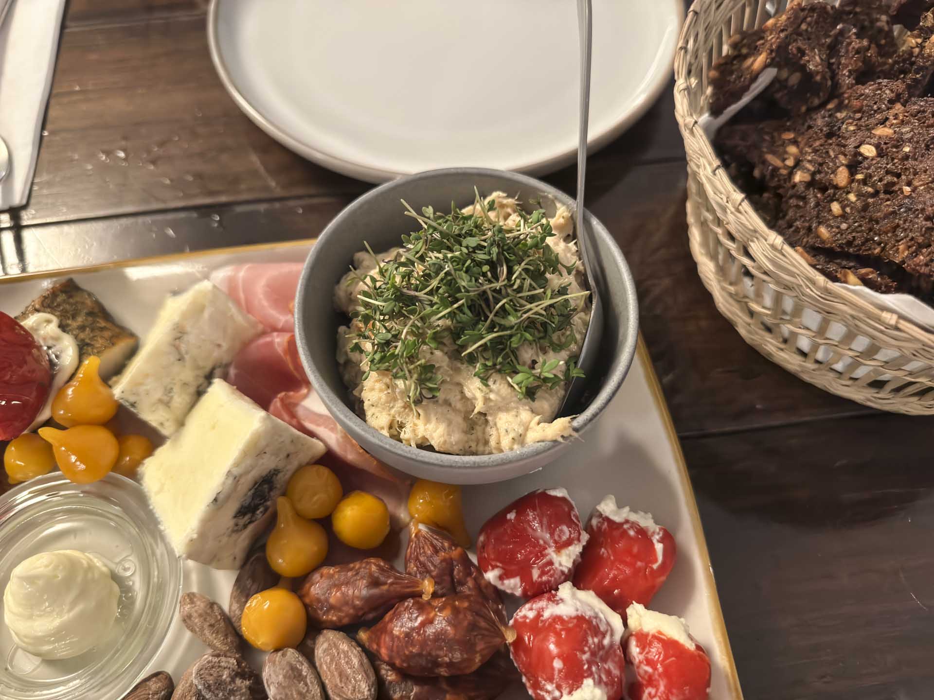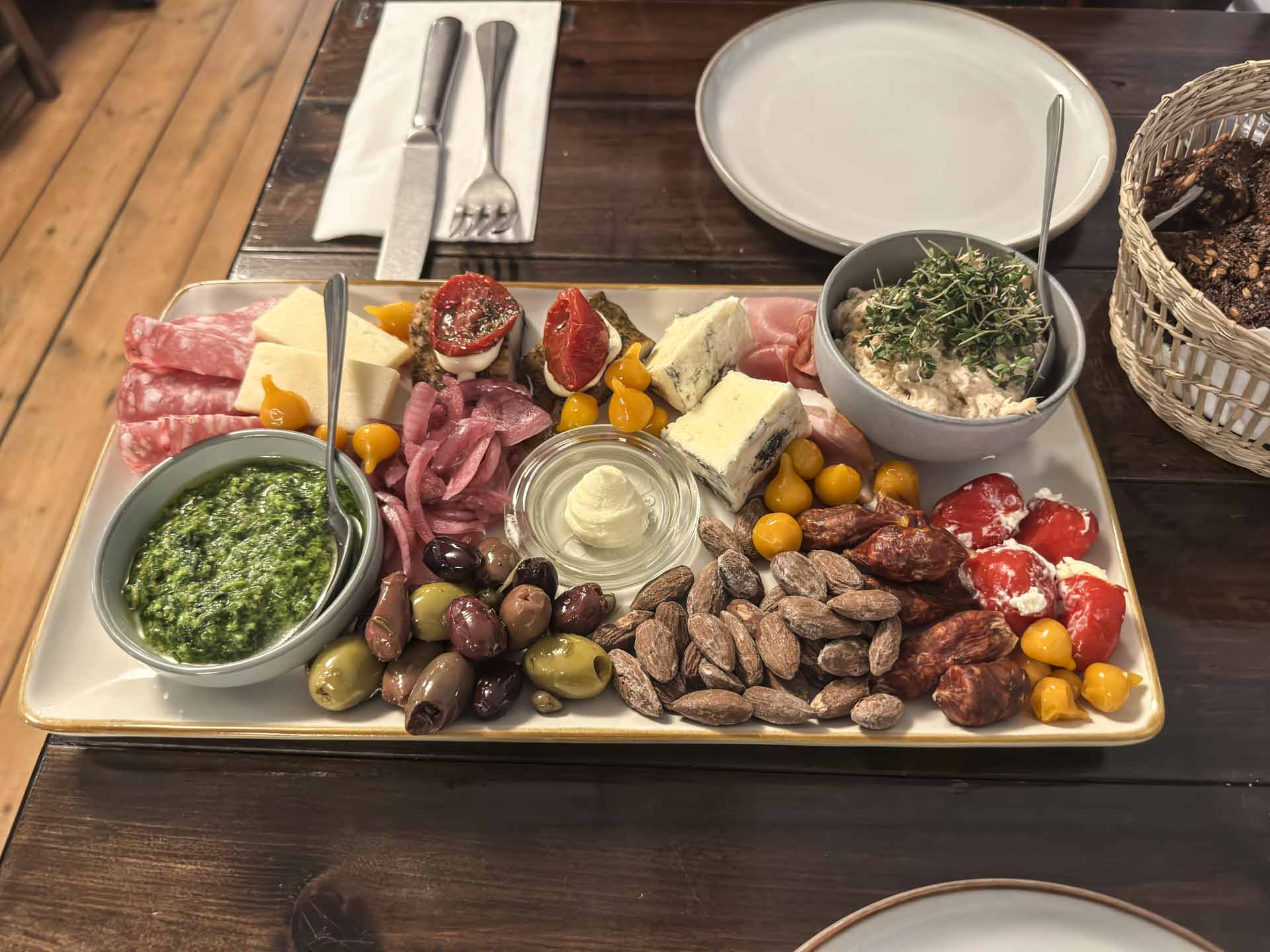 På bordet kom lakserilette, fennikelsalami, spegeskinke, røget makrel, oliven, to oste, saltede mandler, syltede rødløg, søde piquante pebre fyldt med blød, hvid ost, persille pesto, rørt smør, rugbrødschips og hjemmebagt maltbrød.