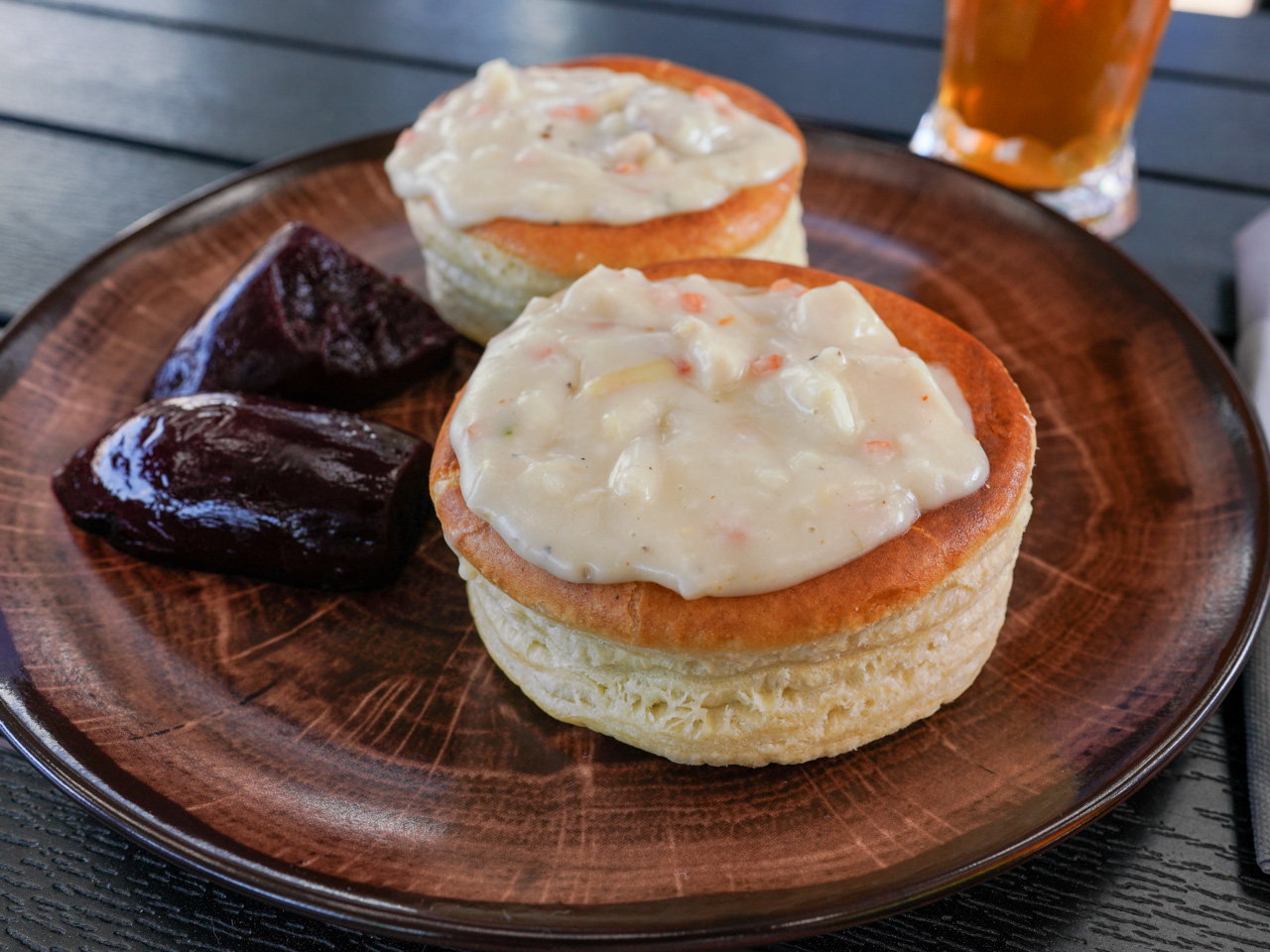 Blandt de mere fyldige retter fandtes fish ’n’ chips, hvor tre slags fisk – kulmule, sejfilet og torsk – blev serveret med sprøde fritter, frisk citron og hjemmelavet sauce tartare. Prisen var 139 kroner.