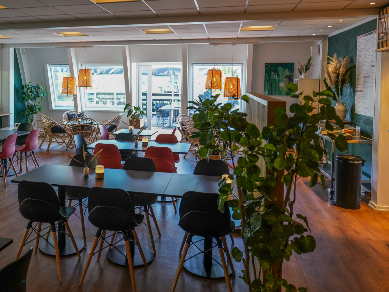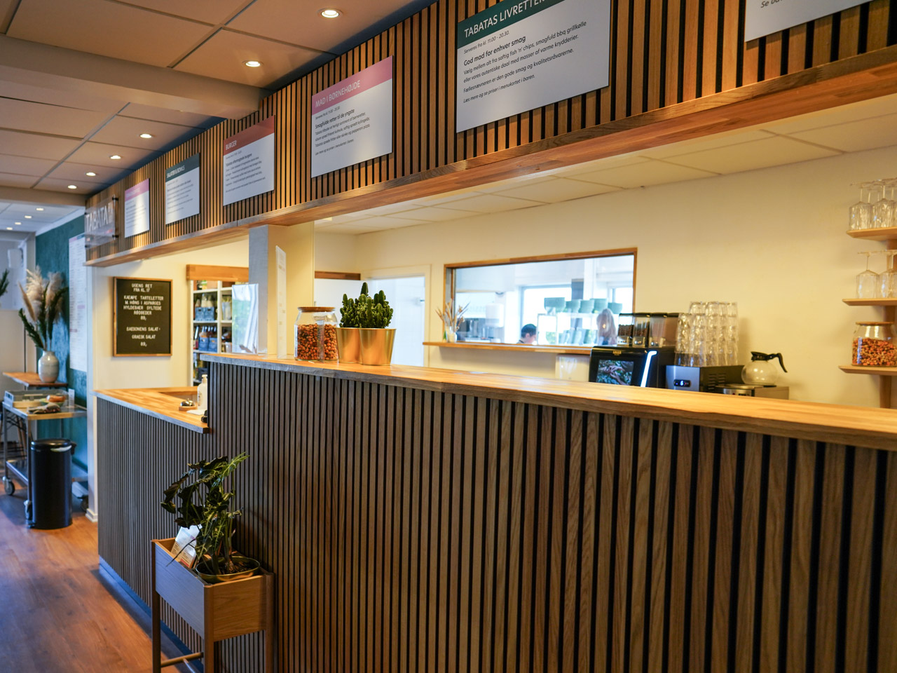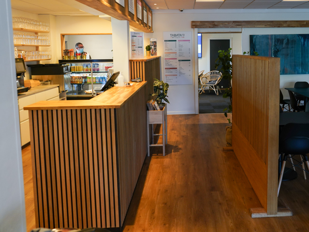 Noget af det særlige ved Tabata Foodpoint var stemningen. Det var langt fra givet, at et spisested i en sportshal ville være hyggeligt, men her lykkedes det. Indretningen var pæn og afslappet med god plads, grønne planter, lys på bordene og kurvemøbler, man kunne synke ned i. Stedet havde en caféagtig atmosfære på den gode måde.